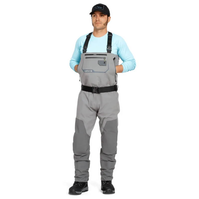 The Orvis PRO Wader is built for the professional angler whether by trade or simply by passion who will go to whatever extreme necessary to find fish. Built with an athletic fit, the PRO Wader uses an extremely durable proprietary 4-layer Cordura fabric shell in the upper and 5-layer Cordura fabric shell in the lower legs for the best in class abrasion and puncture resistance. Low profile seam construction and a gusseted crotch enhance movement and seam strength. Modern anatomically correct neoprene booties have less bulk with a true “sock” feel and are more comfortable inside wading boots, while the streamlined PU reinforced mesh gravel guard covers the boot tightly and completely eliminates drag and water collection.Convenience features include an external storage pocket with YKK AquaGuard water-resistant zipper to keep essentials dry and prevents loss. Rubberized tabs on suspenders and front pocket daisy chain for tool docking, offer multiple locations for essentials and eliminate chance of puncturing waders or losing tools. Fly patch on front pocket for quick changes and drying. Large four-way stretch power mesh interior pocket expands to fit larger items yet stays out of the way when empty. Kangaroo-style fleece-lined handwarmer pockets with YKK AquaGuard water-resistant zippers. Removable OrthoLite knee pads use the same technology found in the PRO Boot insole for optimal comfort and rebound. Removable accessory pocket allows for quick access to gear and offers the features of a small pack. Adjustable elastic suspenders with opposing buckles for waist-high conversion. Interior hook-and-loop patch accommodates the Orvis waterproof pocket.